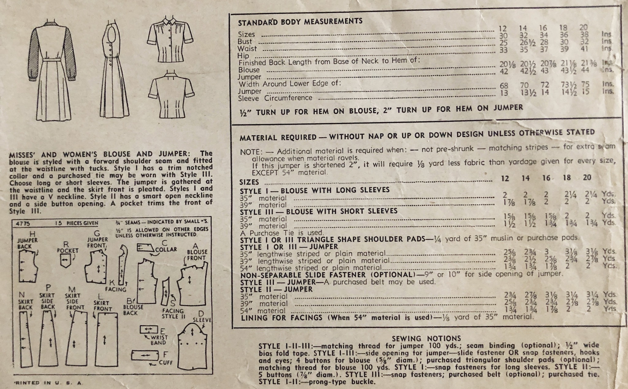 thread for jumper-100 yds; seam binding (optional); ½” wide bias fold tape; zipper or snap fasteners (hooks and eyes) for side opening jumper; 4 buttons for blouse ( ¾” diam.); purchased triangular shoulder pads ( optional);