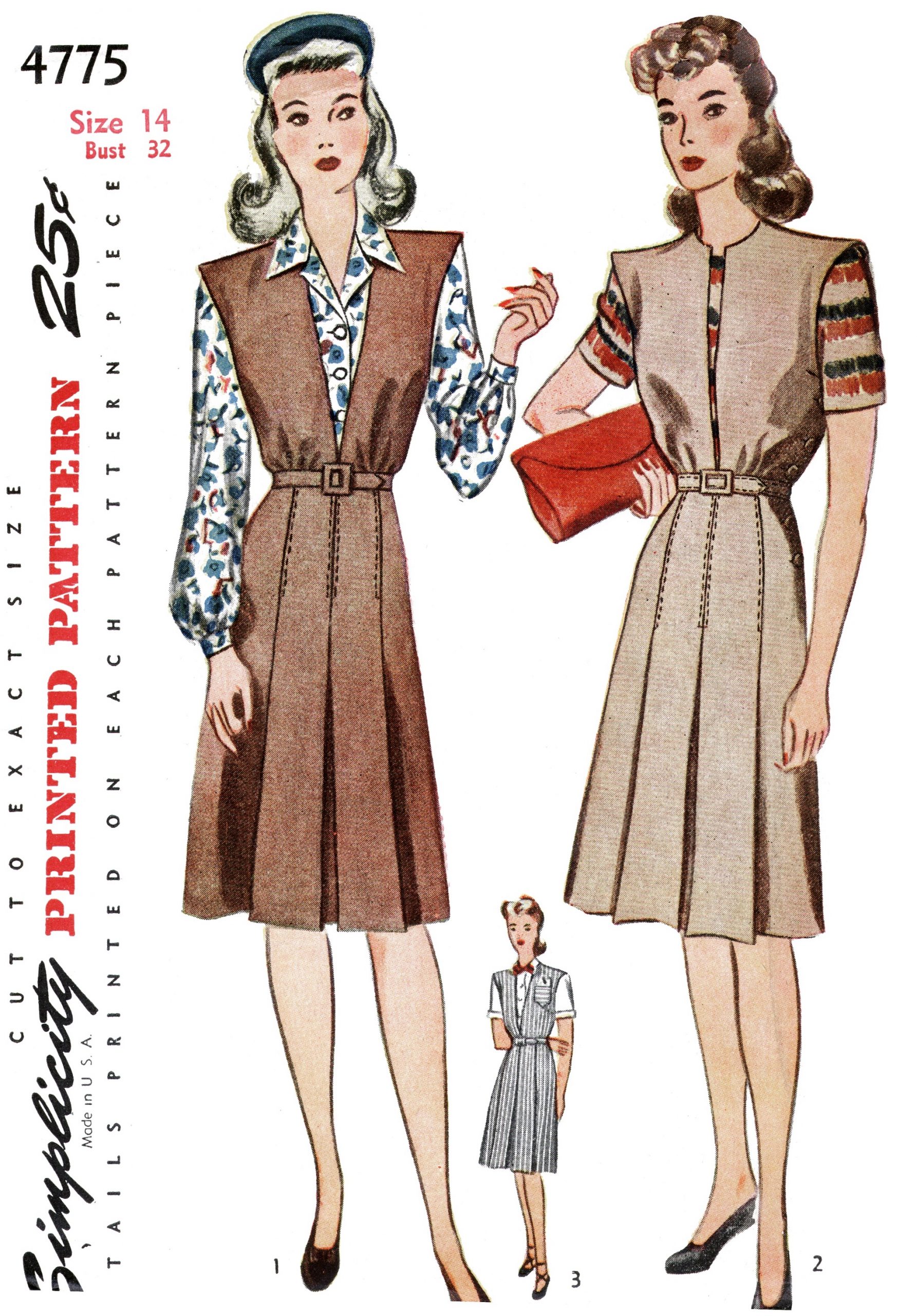 simplicity 4775; ©1943; miss 14; bust 32″: from 1943, this 2 piece pattern consisting of a blouse and jumper dress in 2 versions, is a fun and versatile addition to your wardrobe. This 1940s vintage, factory folded pattern helps you create a fantastic piece of fashion history. It’s easy-to-wear, adding a great touch to any forward-thinking wardrobe, looking fashionable in soft pastels with bright colored bra tops or fine knit tops underneath. you can achieve a dark look with black linen or wool and a blouse of batist, dark lace, or black silk.