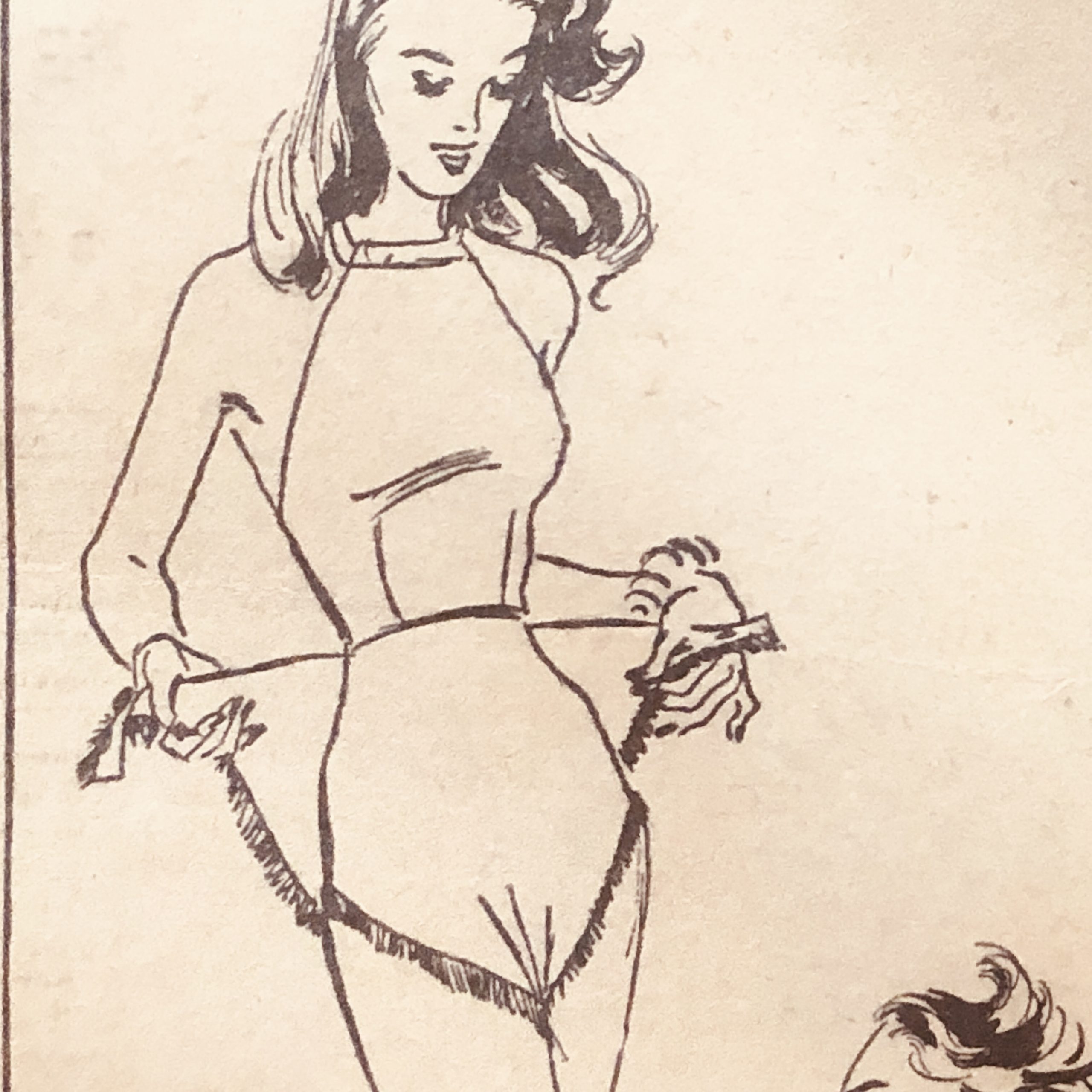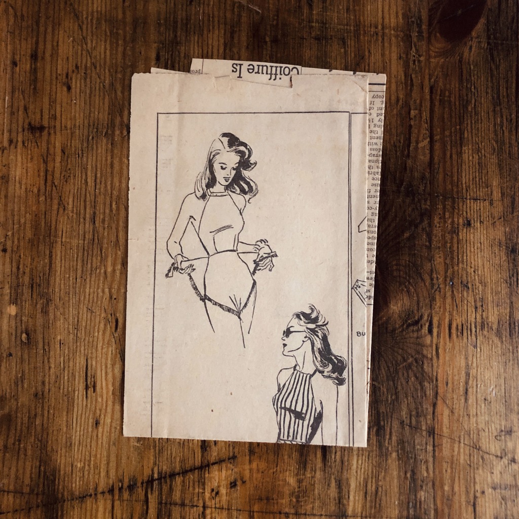 This vintage newspaper pattern helps you create a diaper swimsuit or sun suit. This is an iconic style of the mid 1940s. Consisting of a halter top with bare back and wrap shorts. A diaper bathing suit for young miss. Two piece suit is made of fully lined woven cotton, the pants & halter top wrap with button closing. The top ties at the neck with a cord. Pants are uniquely trimmed with moss fringe.