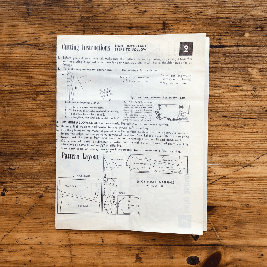 This is a tissue paper pattern for recreating the styles shown on the instruction sheet. The original pieces are perforated tissue paper and should be handled with care. The instruction has a drawing of the style, text description, cutting guide, piece diagram, material useage chart & includes the process of construction with some tips.