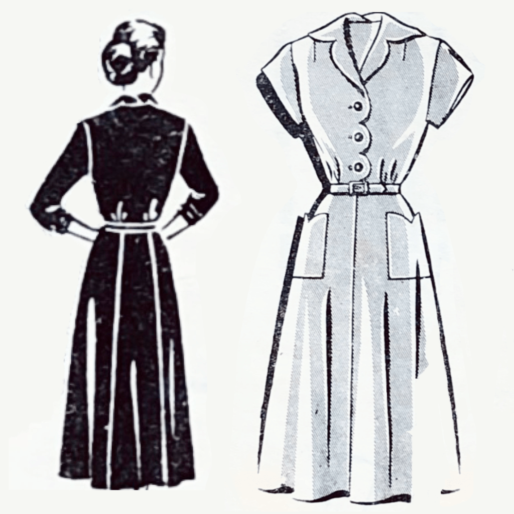 This pattern makes a slim-fitting dress with button front bodice.