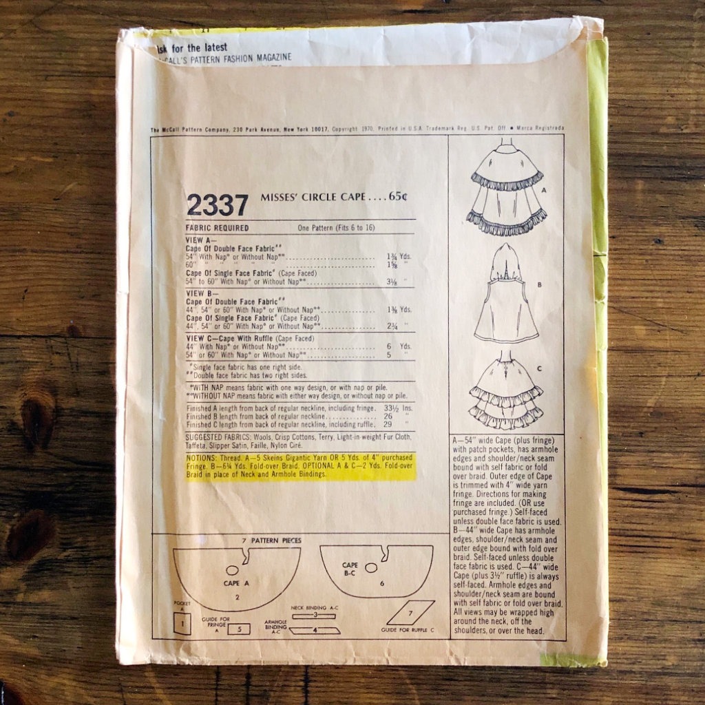 McCall’s 2337; ©1970; all size; circular cape pattern: