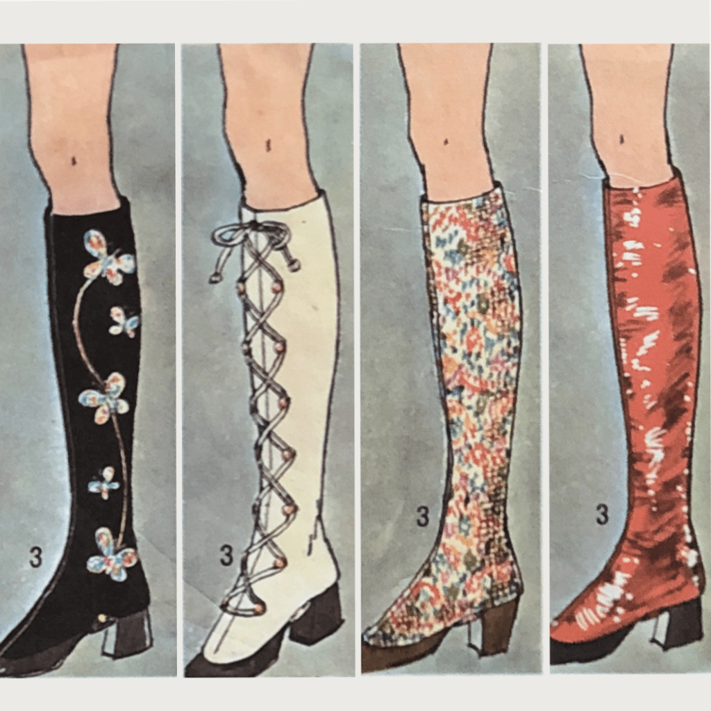 The pattern includes: a fully lined box bag or purse with heart appliqué and zipper closing (View 1). A classic satchel or boho bag with lined flap in View 2 or zip-up spats (V. 3 ) with elastic foot strap. There are special stitch lines to make spats larger or smaller. The spats can be trimmed with appliques, metallic trim, buttons, lacing, etc. Spats can also be used as skate covers.