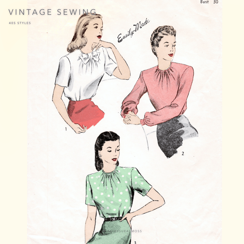Though not specified, lightweight rayon or silk crepes are a good choice for soft blouse. The forties are also known for jersey clothing in silk, wool or rayon.