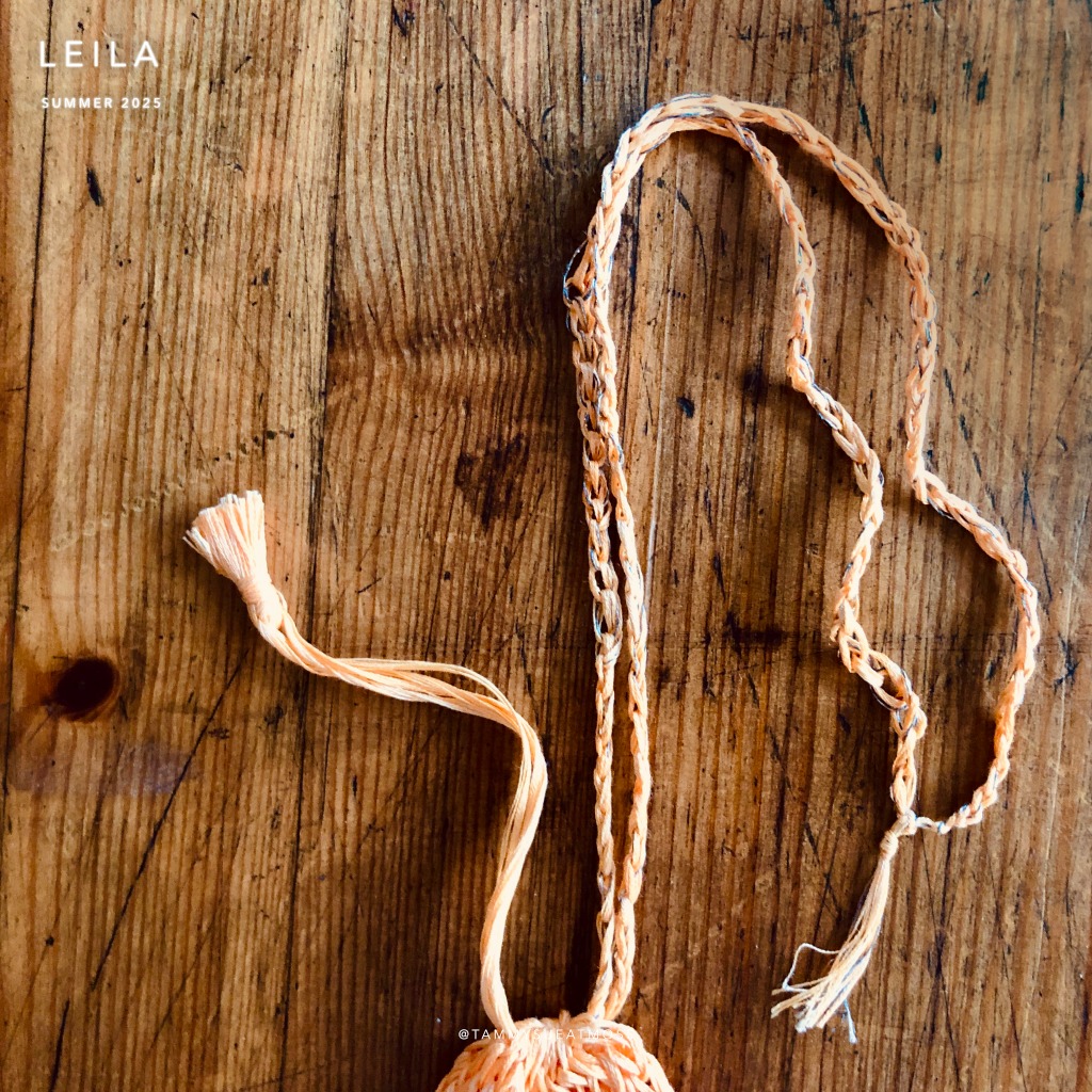 This orange silk version is pre-washed. The chain has a metallic stone gold thread woven in. This is a basic version with hanging loop. If you would like a charm added, it’s possible. The talisman dolls are custom-made and can be added to any plain version for 15€. Checkout this listing: SS25 leila charm add-ons